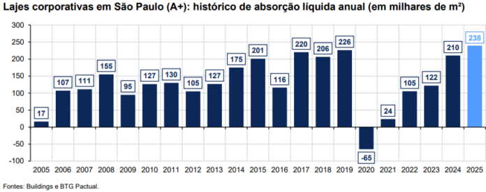 Vacância em queda e preços firmes devem sustentar mercado de lajes em 2026, diz BTG