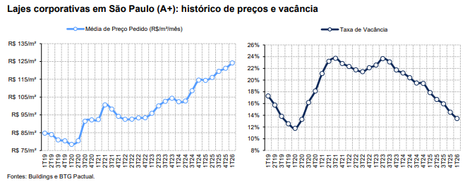 O mercado de lajes corporativas de alto padrão em São Paulo manteve, no início de 2026, a trajetória positiva observada ao longo do ano passado, segundo avaliação do BTG Pactual. Em relatório, os analistas Daniel Marinelli e Matheus Oliveira pontuaram que, entre janeiro e março (1T26), a taxa de vacância do setor chegou a 13,4%, […]